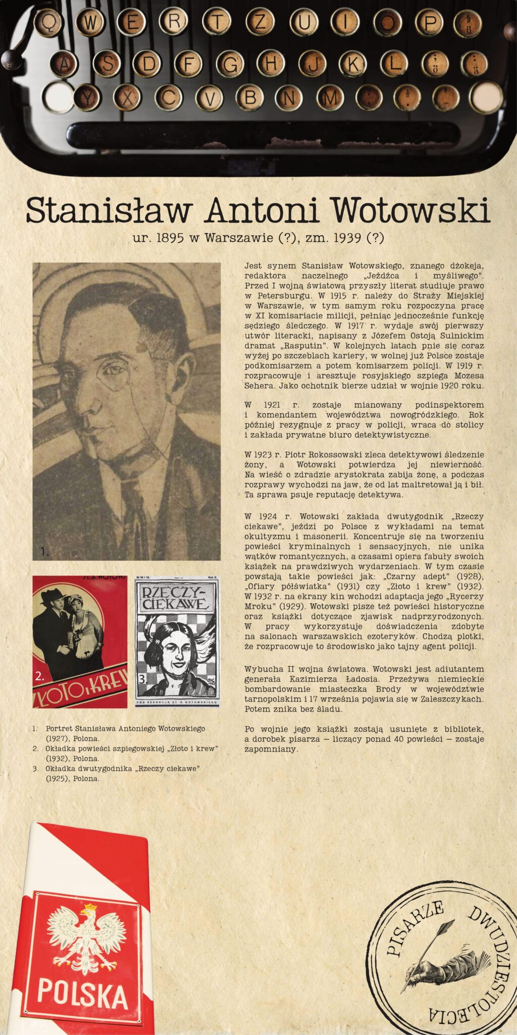 Wystawa „Pisarze dwudziestolecia” ma na celu przybliżenie sylwetek polskich literatów tworzących w czasach II RP, ale nie prezentację nazwisk powszechnie znanych, a pokazanie twórców często już zapomnianych, pomijanych w popularnych opracowaniach. Wśród jedenastu postaci prezentowanych na wystawie pojawiają się twórcy literatury, którą gatunkowo można dziś uznać za kulturę popularną, autorzy kryminałów, książek przygodowych oraz powieści dla dzieci i młodzieży. Z twórców współcześnie rozpoznawanych pojawiają się na niej: Emil Zegadłowicz, autor kontrowersyjnych „Zmór” i „Motorów”; Stefan Grabiński uznawany na świecie za klasyka literatury grozy; Andrzej Strug, pisarz i działacz niepodległościowy oraz Zofia Kossak-Szczucka, specjalistka od prozy historycznej. Zapominanych już często autorów kryminałów reprezentują na wystawie: Andrzej Błażejowski, lwowski adwokat i dziennikarz, który wiedzę o przestępczym półświatku przelewał na strony swoich powieści; Stanisław Antoni Wotowski, policjant i prywatny detektyw, który chwycił za pióro stając się jednym z najbardziej poczytnych przedwojennych autorów; Urke Nachalik, były kryminalista, dla którego tworzenie literatury stało się formą resocjalizacji i przyniosło sławę nie tylko w Polsce, ale również w Stanach Zjednoczonych. Literaturę adresowaną do dzieci i młodzieży tworzyły Maria Juszkiewiczowa, specjalistka od tematyki orientalnej i Zofia Dromlewiczowa, która była również pionierką filmowego krótkiego metrażu i pisała książki inspirowane światem kina. Literaturę bliższą dzisiejszemu reportażowi autobiograficznemu tworzył Zbigniew Uniłowski, a Antoni Marczyński specjalizował się w twórczości przygodowej i sensacyjnej.